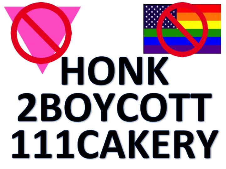 So moving on to the protest, I kept with my more neutral, “kinder and gentler” signs, having learned my own lessons about love and compassion and consistency. I mainly used the “Honk 2 Boycott 111Cakery” signs…and continued to get a lot of honks. I’d guess about 30-40% of the cars that passed by honked. For me, that was rewarding.