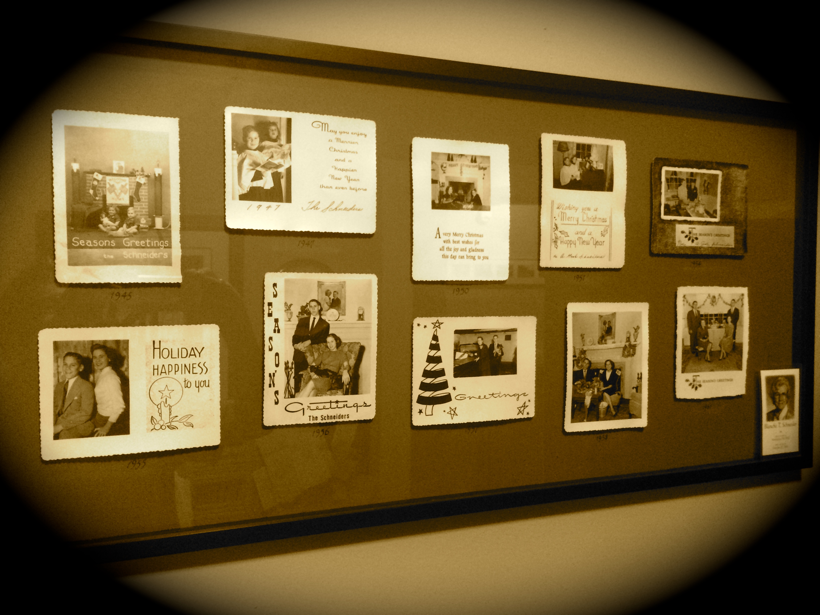 • One is a collection of homemade Christmas cards that my mom’s parents had printed each year from ~40’s to the ~60’s, which I had specially mounted several years ago, proudly displaying them as they should be.  They remind me of my mom and grandmother.  I love the different clothing styles, and fonts/expressions that mirror the changing times…