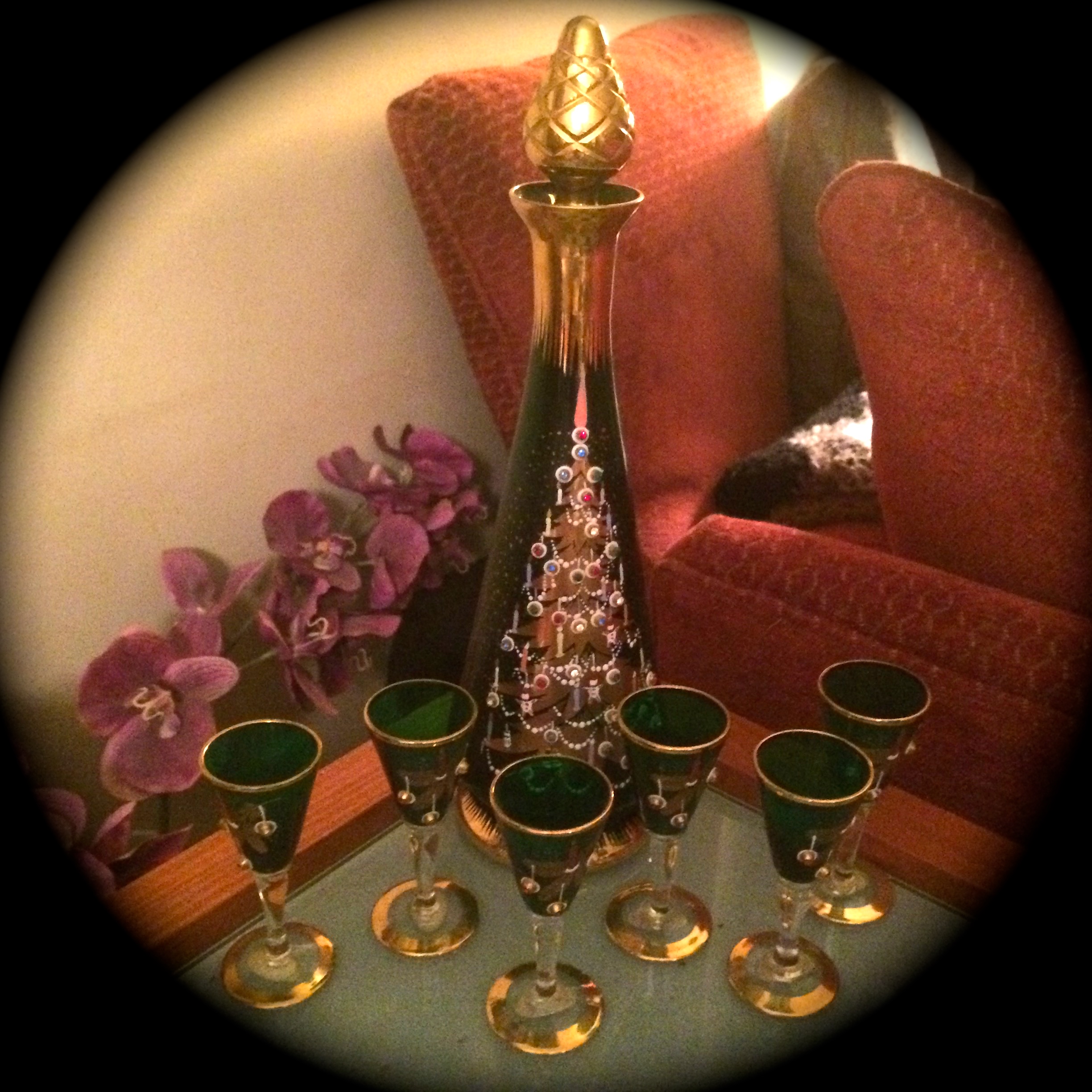 • One is an original decanter and glass set for Creme de Menth that my grandmother Blanche gave me.  Very “kitsch” – something that nobody else in the family wanted, so she was ecstatic when her “gay grandson” was thrilled to give it a good home.