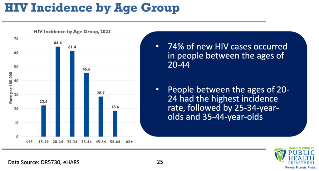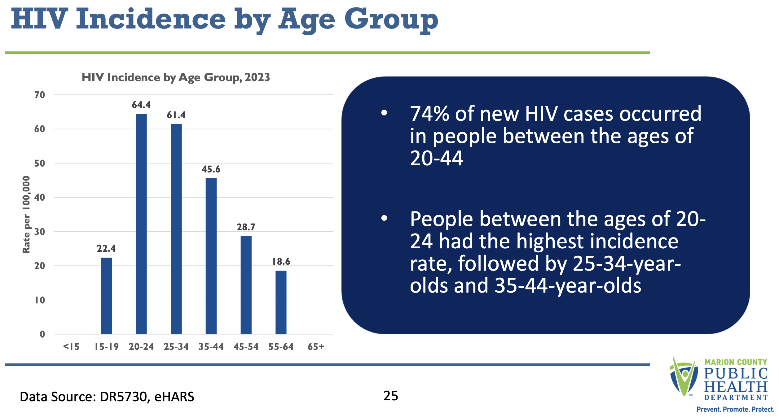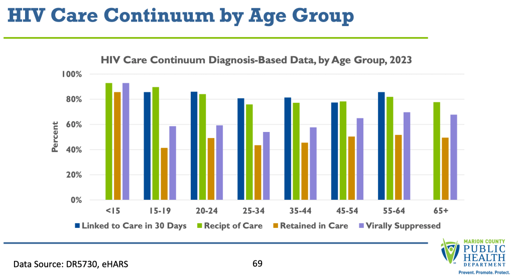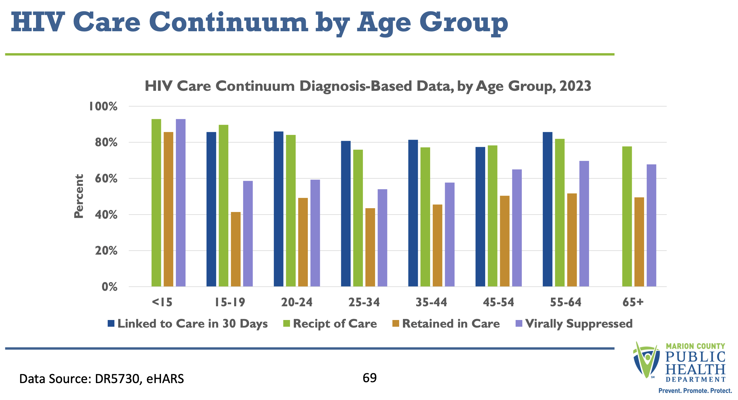 First, how do we better engage young people, because the highest rate of new cases in Marion County is ages 20-24 (see first graph below). We struggle to engage this age bracket! What are their unique needs? What are their unique challenges and opportunities? We also see the lowest retention in care and viral suppression rates for ages 25-34. We’ve got to do better prevention (including PrEP & testing) and engagement in care — doing so in culturally and ethnically accessible ways. WE MUST DO BETTER. (Source: 2023 Marion County HIV Epidemiology Profile